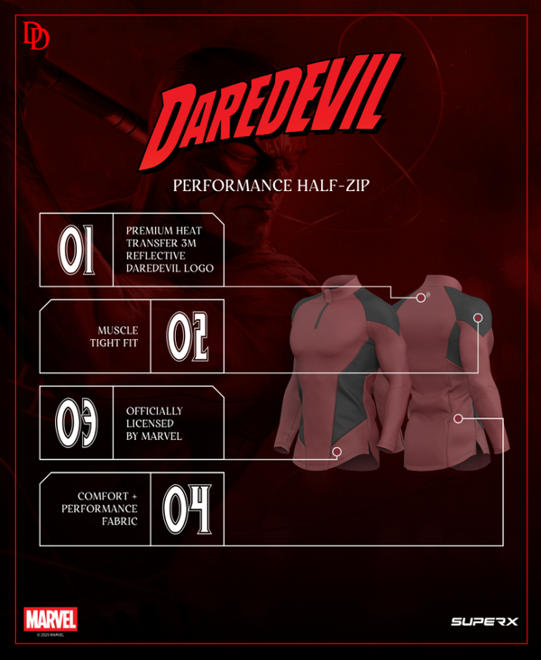 Step into the fight with the officially licensed Daredevil Activewear Collection in collaboration with Marvel—crafted for those who refuse to quit. Inspired by the resilience and raw determination of Hell’s Kitchen’s protector, this collection blends performance-driven engineering with subtle yet powerful design details from Daredevil’s legendary suit. The Devil’s in the details with braille embroidery, fighting stick inspired aglets and precision made to be felt - not just seen.